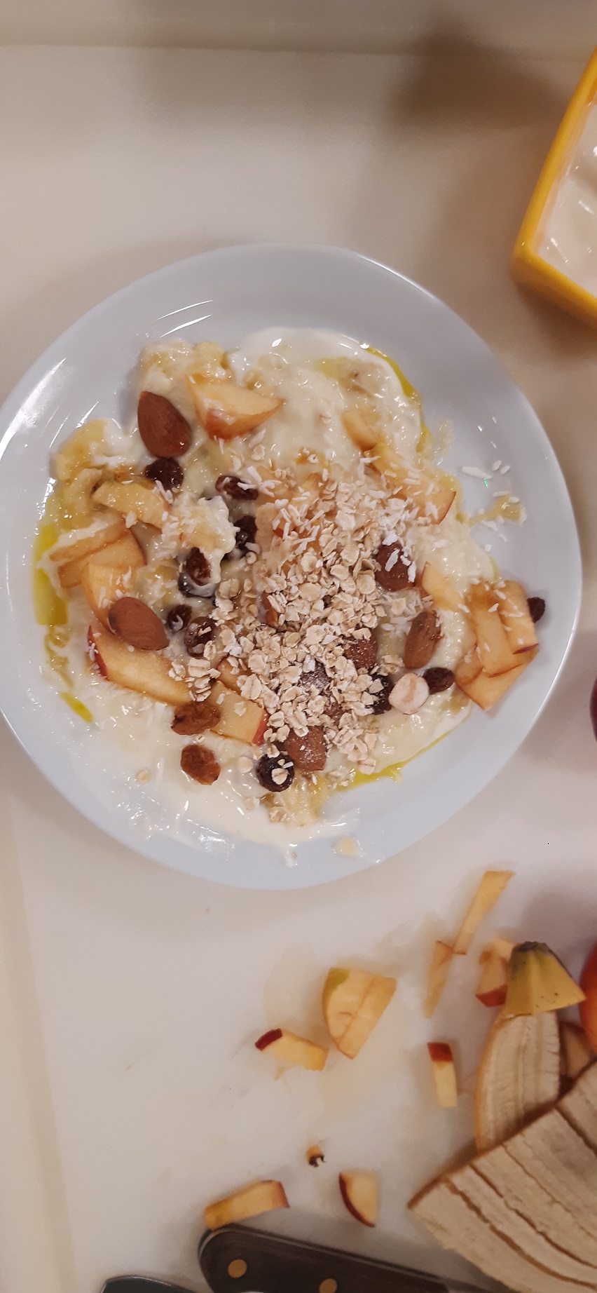 Rajouter du yaourt ou du fromage frais, des fruits coupés (exemple: pomme) et des fruits secs ( amandes, noisettes....) , des morceaux de figues séchées, de dattes,raisins secs... ce qui vous fait plaisir.